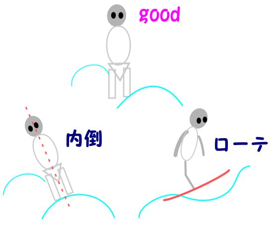 コブが上手く滑れない原因として「後傾・内倒・ローテーション」を上げましたけど、これに当てはまる人は多いと思うんだ